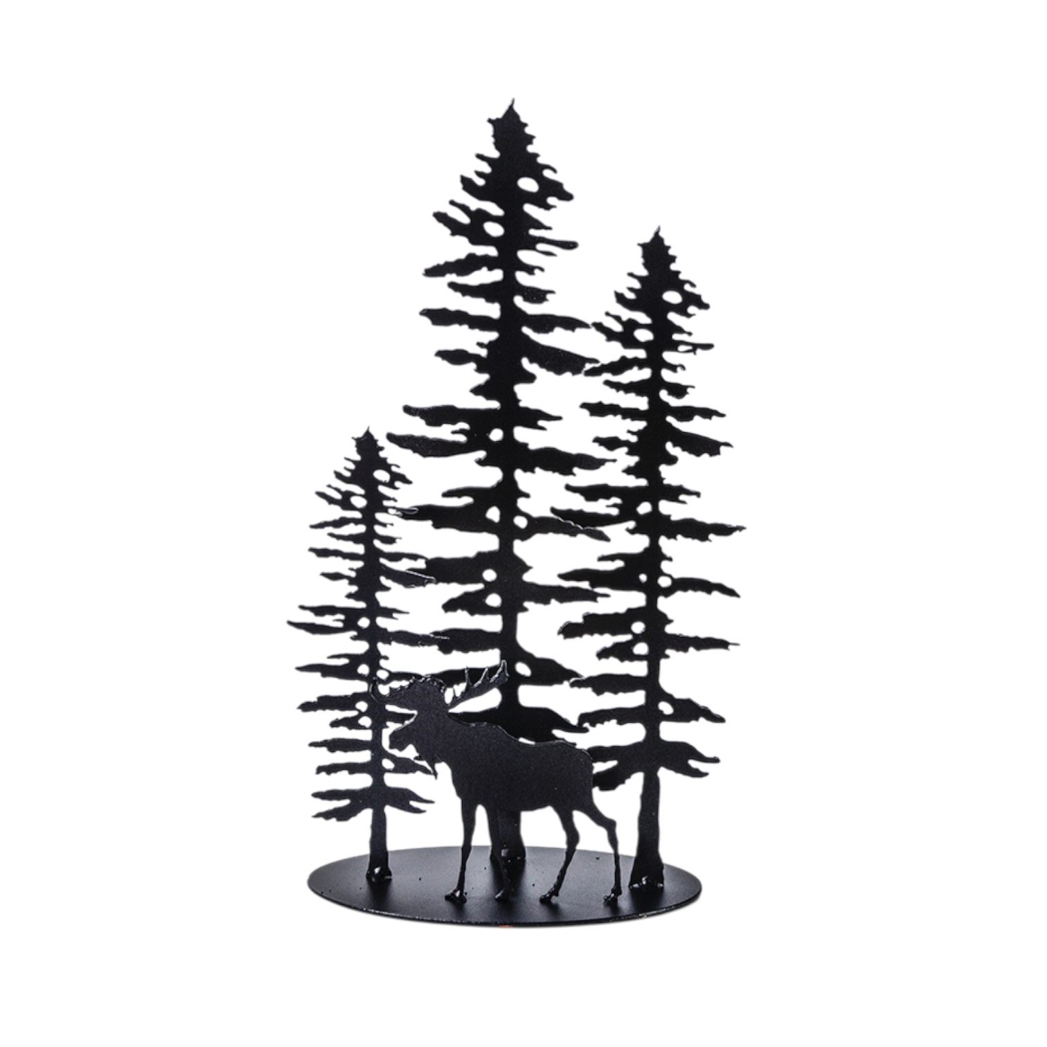 The Three Sitka Moose is a three dimensional metal sculpture standing piece of artwork composed of 3 sitka tree’s with a single Moose roaming in front. Designed by Jack Willoughby